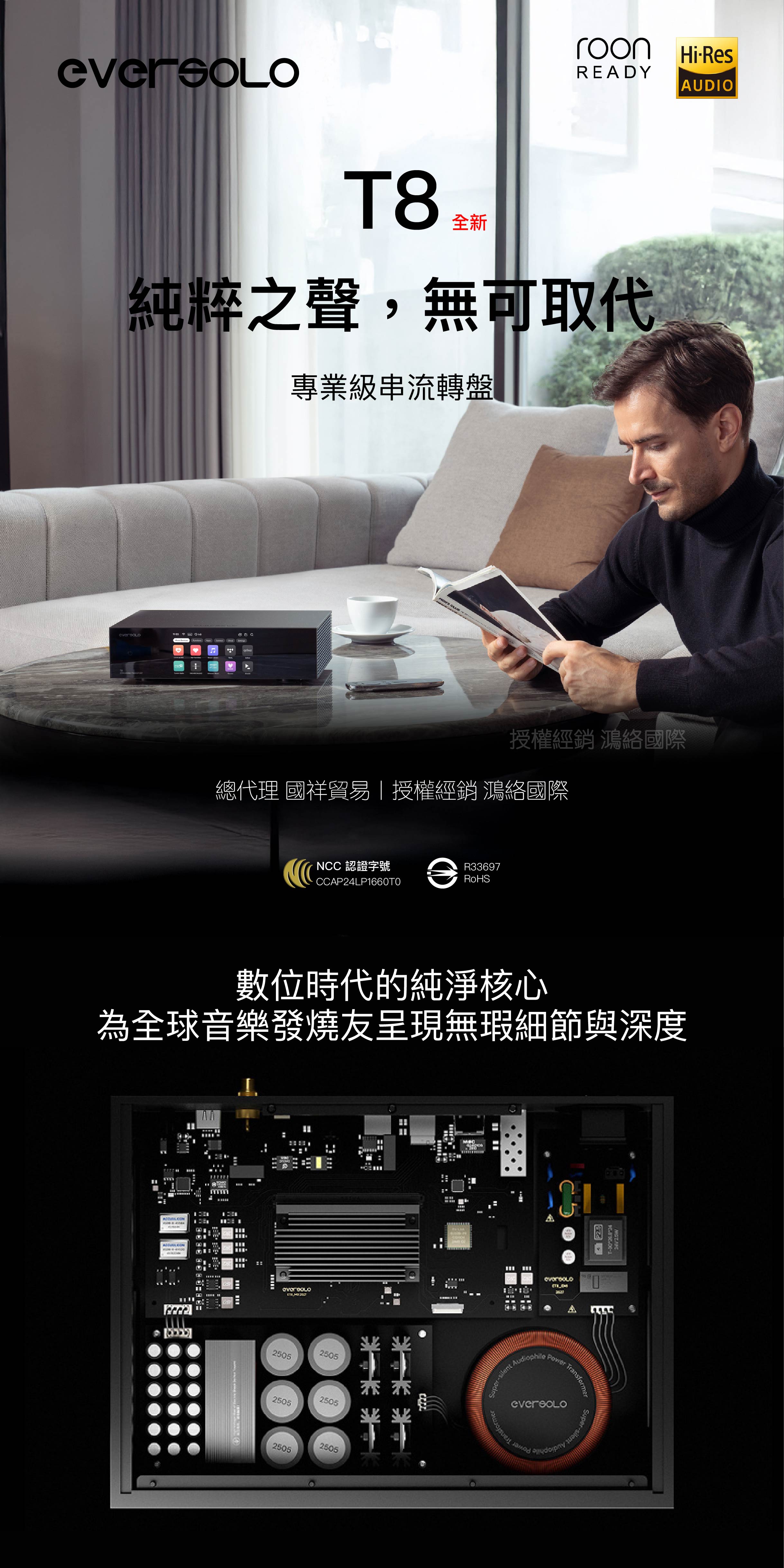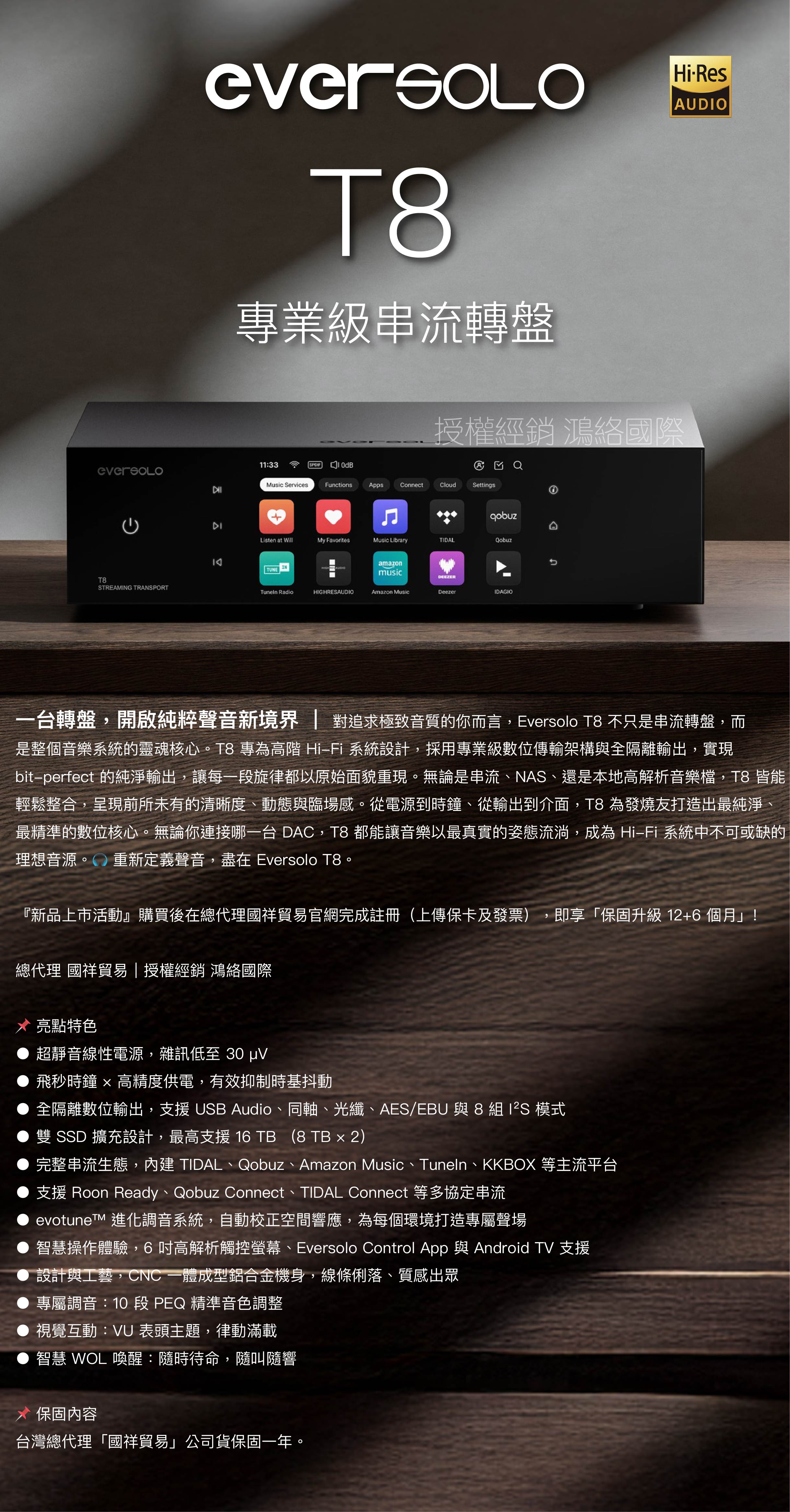 Eversolo T8 — 專業級純數位串流轉盤,飛秒時鐘與超低雜訊線性電源,重塑音樂純淨之美。支援 TIDAL、Qobuz、Apple Music、Roon Ready 與 evotune™ 空間校正。